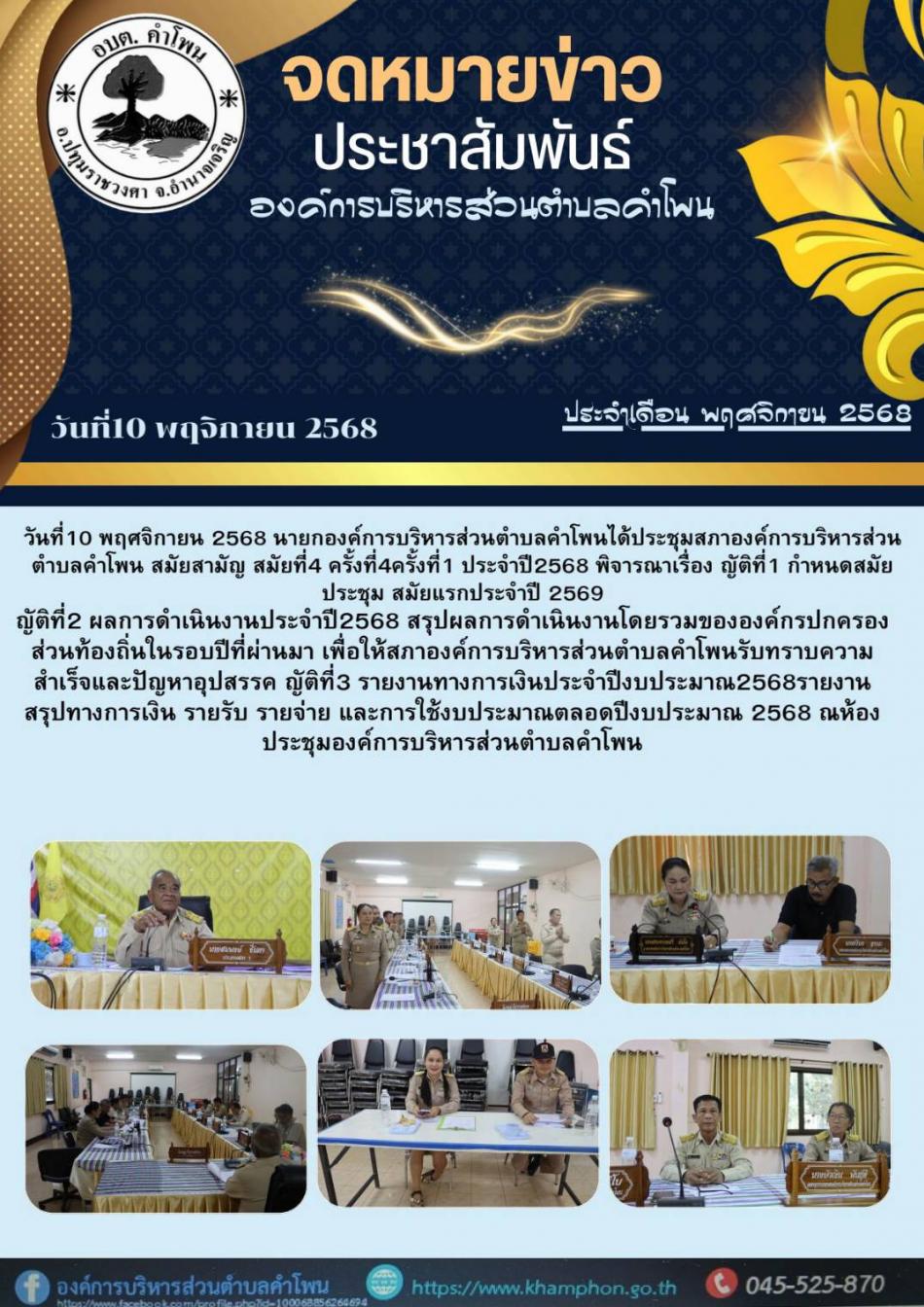 วันที่10 พฤจิกายน 2568ประชุมสภาองค์การบริหารส่วนตำบลคำโพน สมัยสามัญ สมัยที่4ครั้งที่1[10 พฤศจิกายน 2568]
