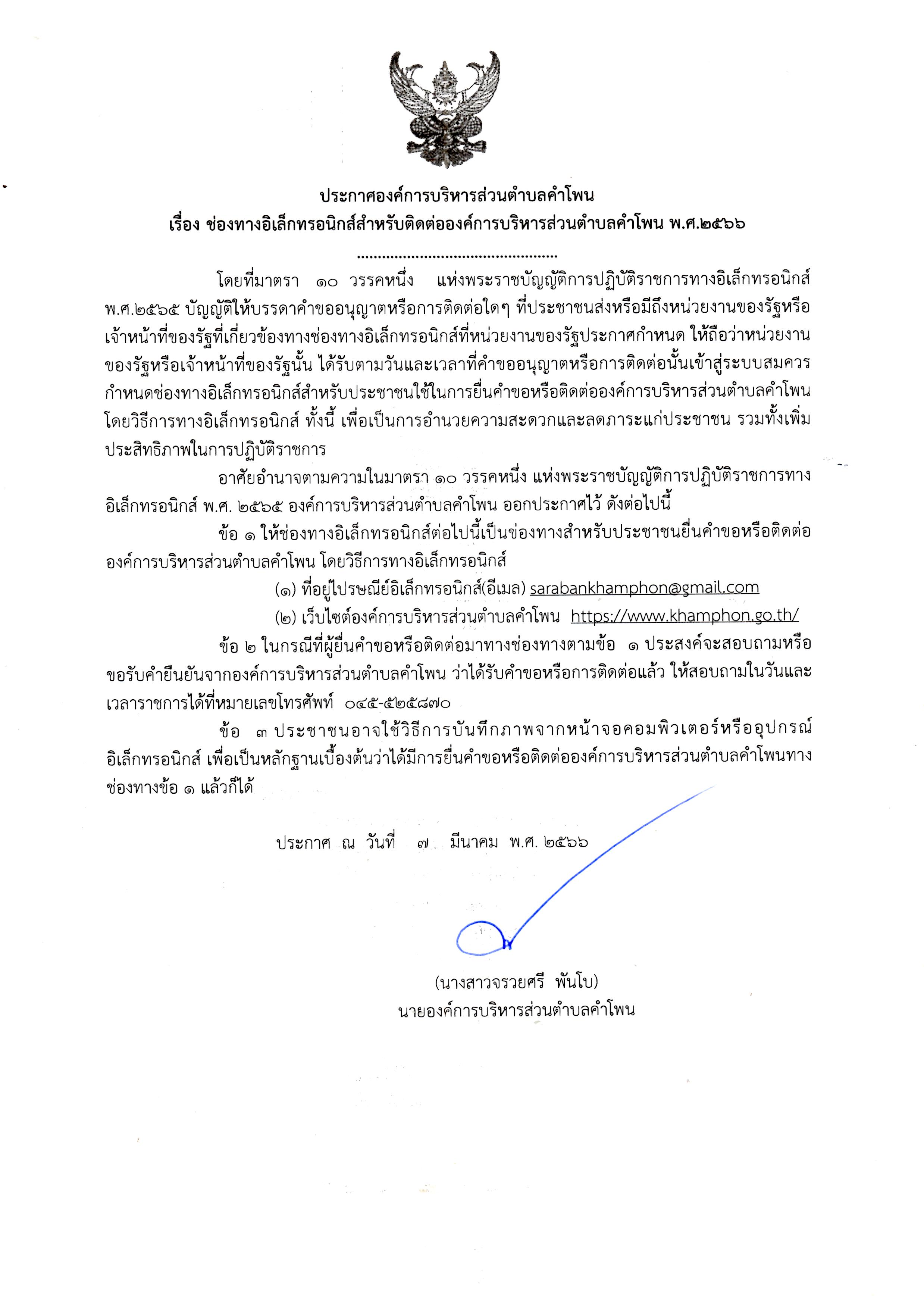 ประกาศองค์การบริหารส่วนตำบลคำโพน เรื่องช่องทางอิเล็กทรอนิกส์สำหรับติดต่อองค์การบริหารส่วนตำบลคำโพน พ.ส.2566