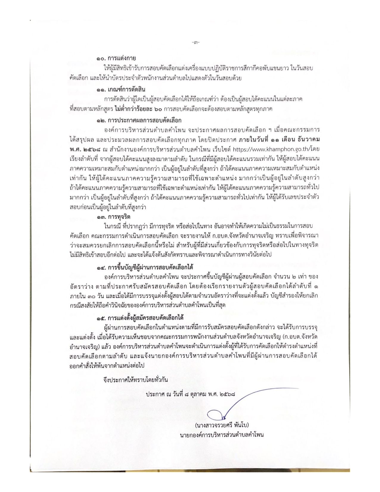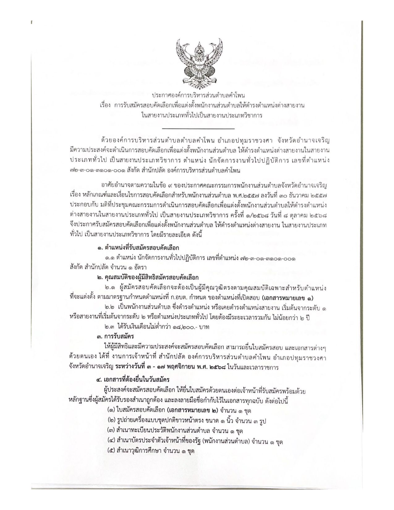 ประกาศองค์การบริหารส่วรตำบลคำโพน เรื่อง การรับสมัครสอบคัดเลือกเพื่อแต่งตั้งพนักงานส่วนตำบลให้ดำรงตำแหน่งต่างสายงานในสายงานประเภททั่วไปเป็นสายงานประเภทวิชาการ